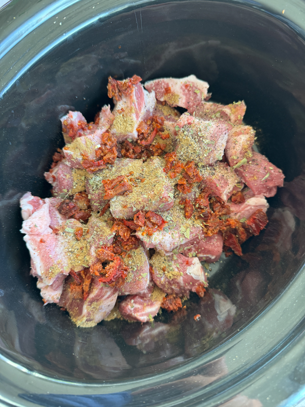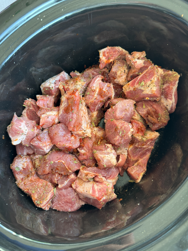 - Cut the pork into 1″ pieces and add them to the bottom of a slow cooker. Sprinkle with oregano, salt, cumin, black pepper, and chipotle. Toss well to combine.