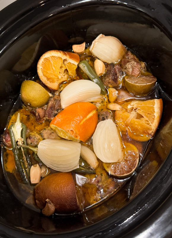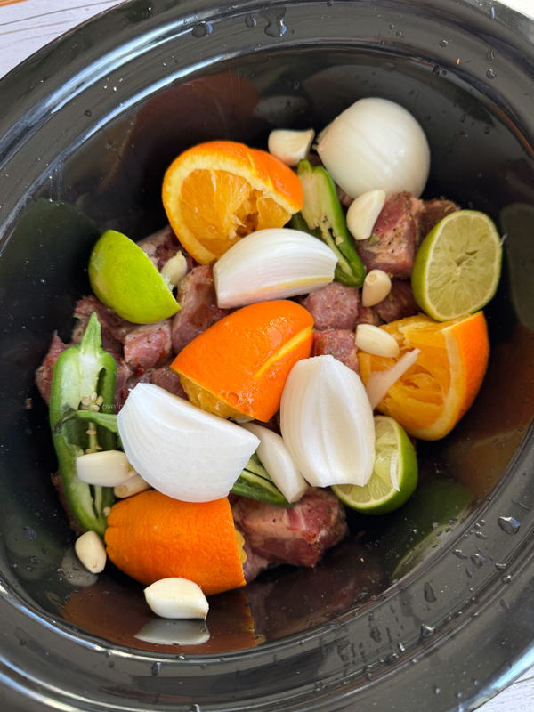 Squeeze as much juice as you can from the orange and lime pieces over the pork, then add the whole lime and orange pieces. Add in the onion, garlic, and jalapeño.