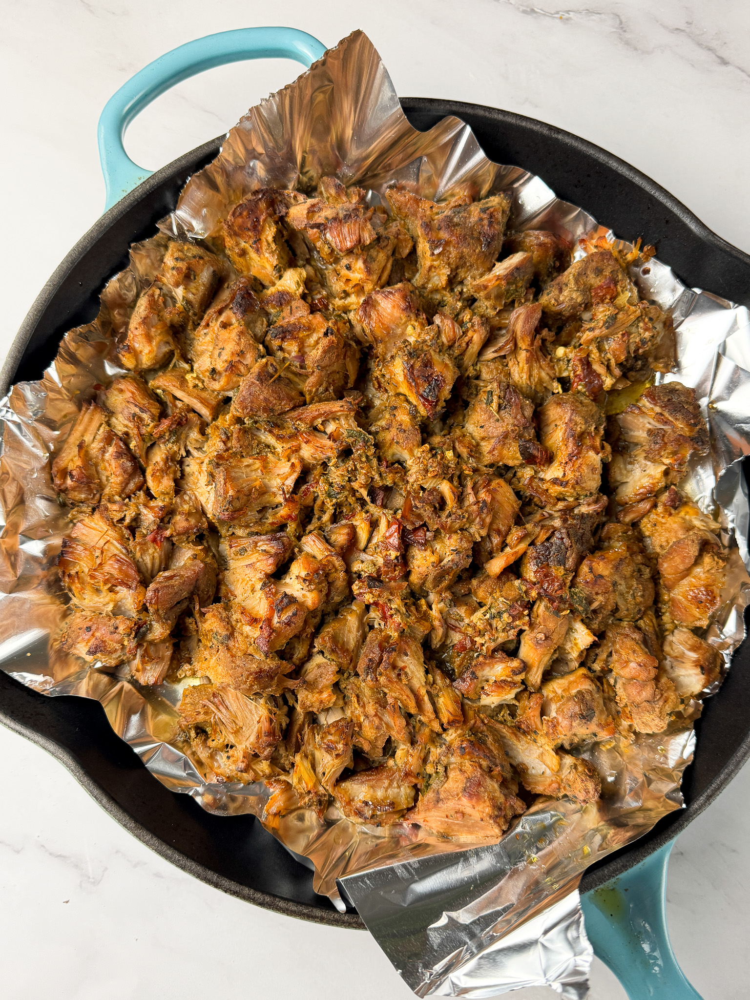 - Cover a tray or oven safe skillet in tin foil for easy clean up. Shred the meat and add as much as you want to serve for dinner in a single layer to the tray. Drizzle lightly with some of the carnitas liquid for extra fat/juiciness.