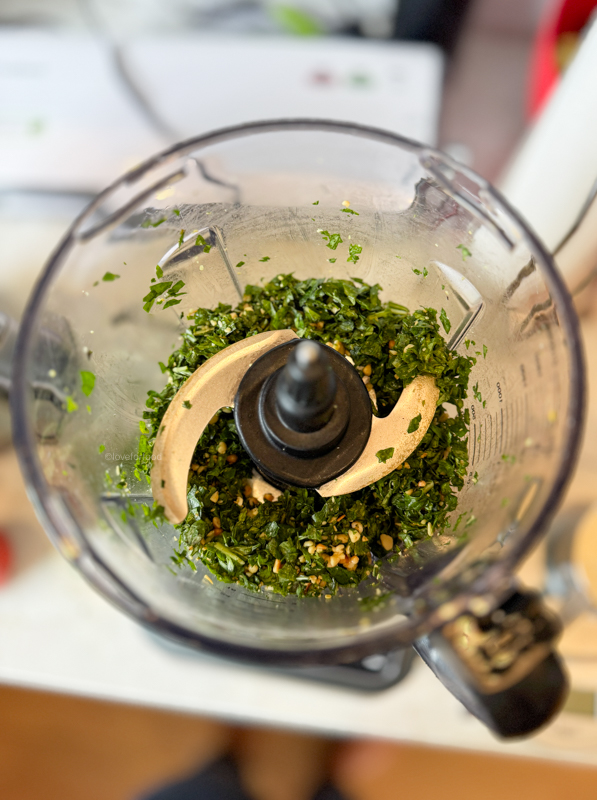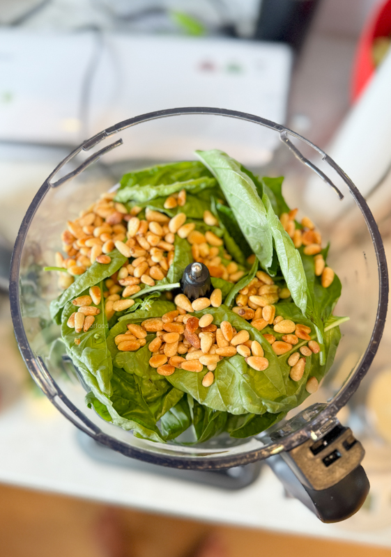 - Process the Basil and Nuts: Once the nuts are cool enough to handle (they can still be a bit warm), add them to a food processor with a blade attachment along with the fresh basil. Pulse or use a chop setting until the basil leaves are finely chopped.