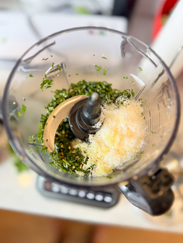 - Blend in the Cheese, Garlic, and Seasoning: Add in the grated parmesan, mined garlic, salt, and pepper. Pulse or use a low speed to roughly chop and blend everything together until it appears more like a paste.
