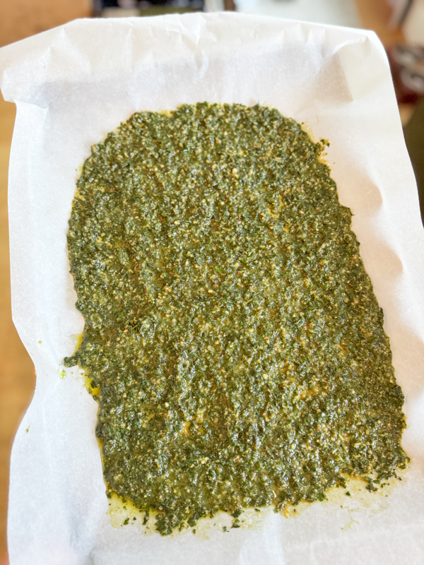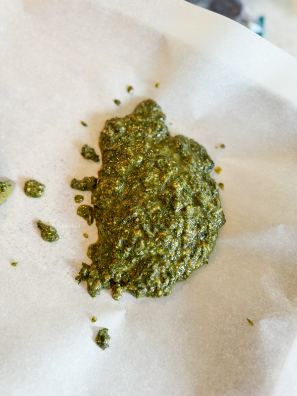 - Freezing Instructions: On a baking sheet, lay down a piece of parchment paper. Evenly spread the pesto on the parchment paper and place in the freezer immediately. Once completely frozen, break or cut into pieces and freeze for up to a year. If making multiple batches, cover with another piece of parchment paper between batches to prevent browning.