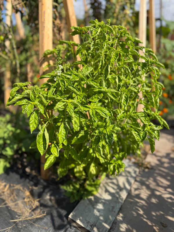 The best variety of basil for pesto is sweet basil, which often have large, broad, shiny leaves that have a ton of flavour. Genovese is a variety of sweet basil that is very popular, but my husband doesn’t like the slight minty-ness of that variety. I like to grow regular sweet basil and Genovese and will throw a few leaves of the Genovese in, up to a 50/50 mix. Mostly I prefer to use the large leaf sweet basil.