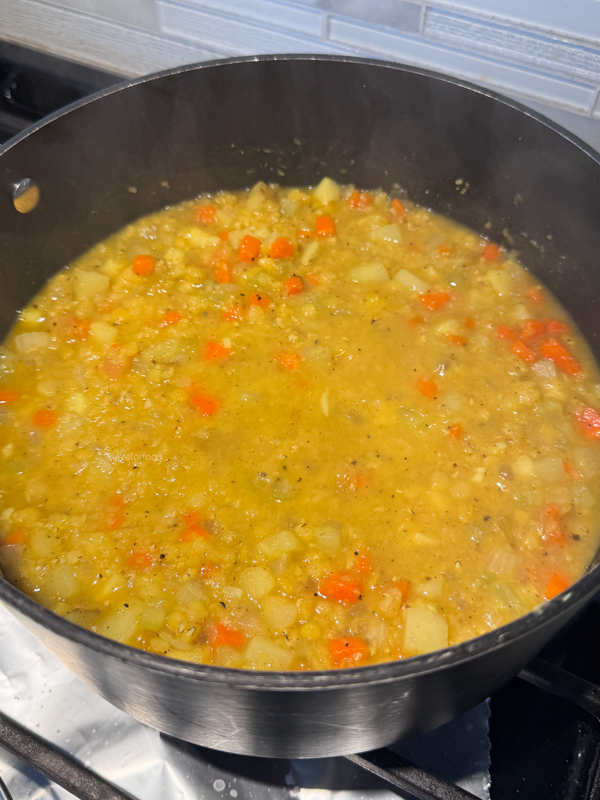 6. Bring the soup to an aggressive simmer, then reduce the heat to low and cover. Cook for 20 minutes or until all the vegetables are tender and the lentils have mostly broken down.
