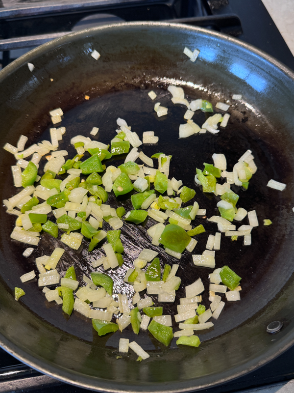 - Preheat a 12″ skillet over medium heat and add 1 tsp avocado oil (or use cooking spray if using a non-stick pan to reduce fat). Once rippling, add in the chopped onion and peppers.
