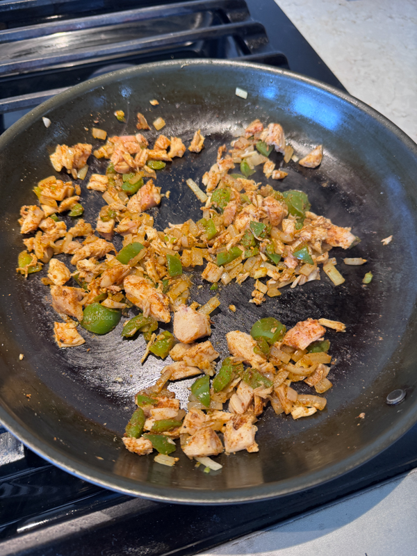 - Cook for 2-3 minutes until softened before tossing in the cooked chicken, 1 ½ tsp seasoning, and ¼ tsp salt per quesadilla. Stir together for 30 seconds – 1 minute until the spices coat the filling and chicken is lightly warmed. Splash a tbsp or two of water in the pan to loosen the spices and transfer the filling to a small bowl or plate.