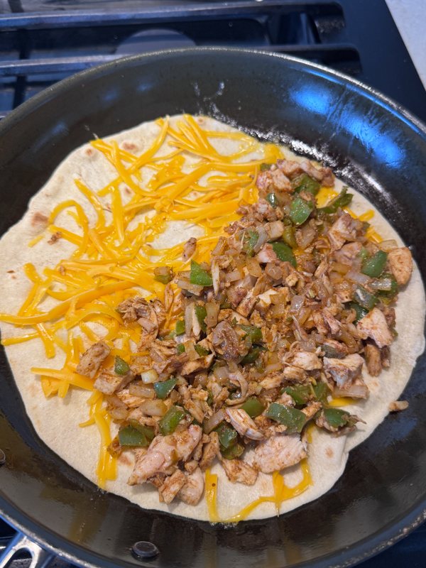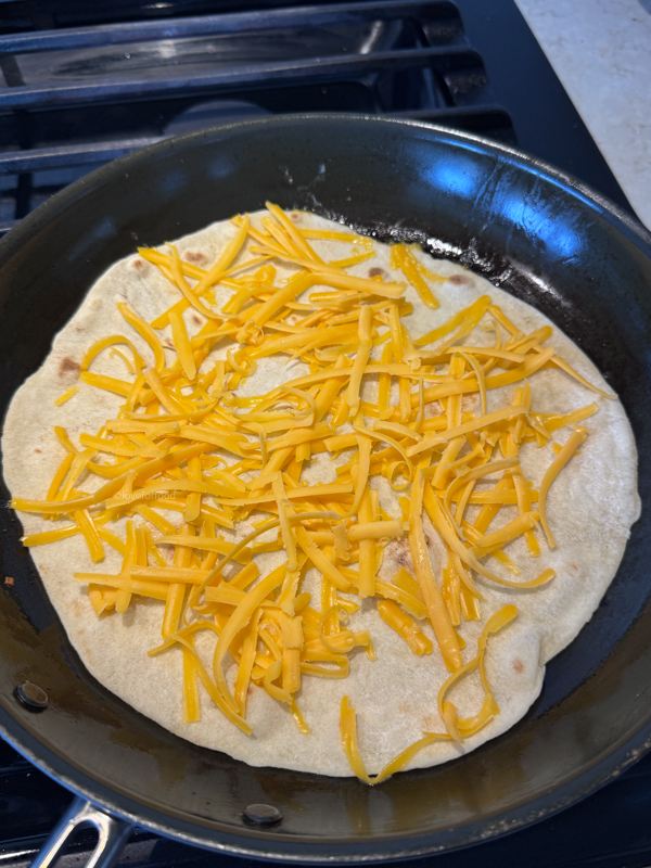 - Place the pan back on the burner and reduce to medium-low. Add a tortilla to the pan and cover with cheese. Allow it to cook/melt ever so slightly before adding the filling mix to one side of the tortilla.