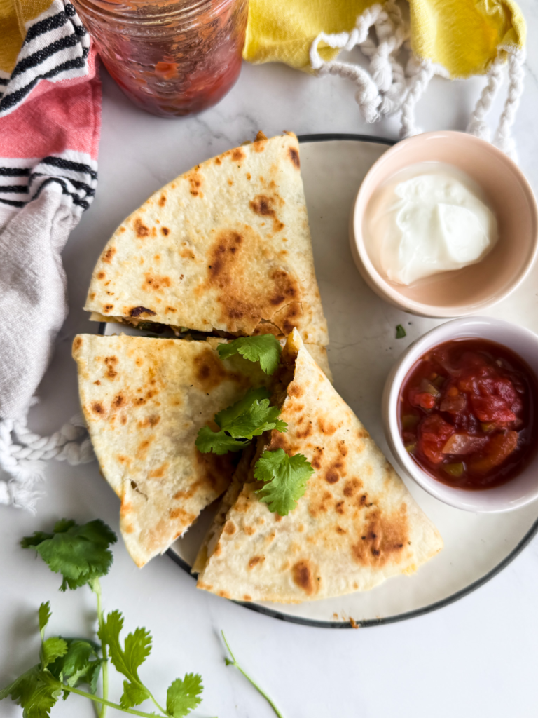 Ya’ll are having a moment with high-protein foods and Costco rotisserie chickens right now, and these quick chicken quesadillas are a perfect fit. If you prep your seasoning ahead of time, you cut a few extra minutes off dinner prep.