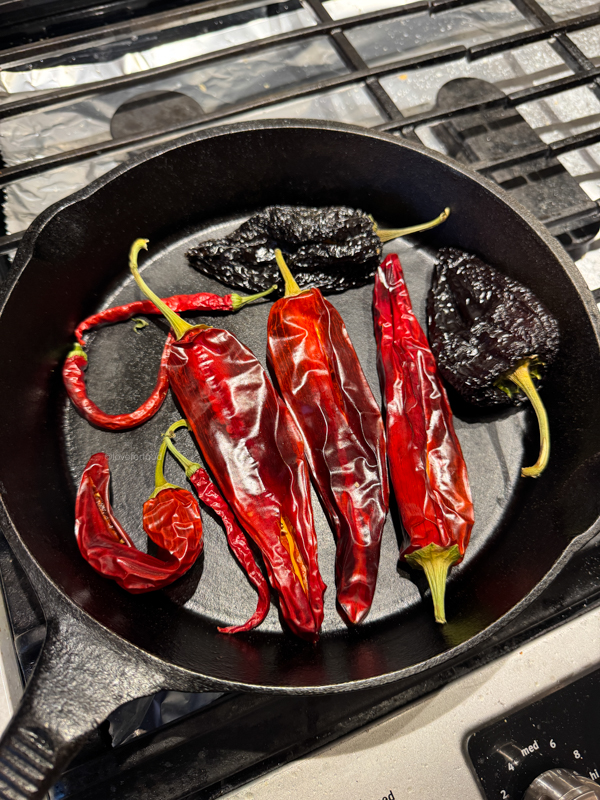 - Dried chilies: I use ancho, guajillo, and arbol chiles in this dish. You can swap them around or adjust the amounts of each if desired. You can often find them in Mexican specialty stores or even at some regular grocery stores! They can be expensive, so sometimes buying in bulk or online is a great option. I grow and dehydrate them at home to make them even more affordable.
