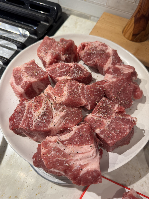 - Preheat a large dutch oven over medium-high heat. While it heats up, prep the pork. Cut the pork shoulder into 2" pieces and season generously with salt and pepper.