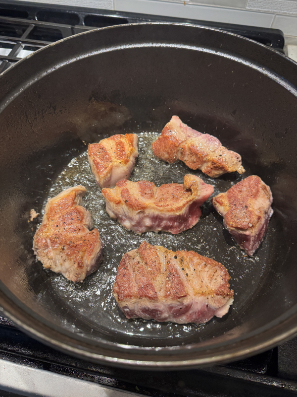 Step 3: Add the tallow or lard and let it melt and ripple before adding half of the pork, ensuring they all have space between them so they can brown. Sear for 2-3 minutes and flip once they’re browned. Sear for another 2-3 minutes. Remove the pork to a clean plate and repeat with the remaining pork. Set aside.