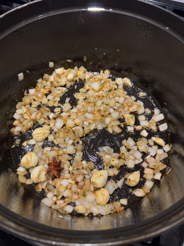 Step 5: Once the onions are brown, stir in the oregano, thyme, peppercorns, and star anise. Toast the spices for 30 seconds, stirring frequently to avoid burning.