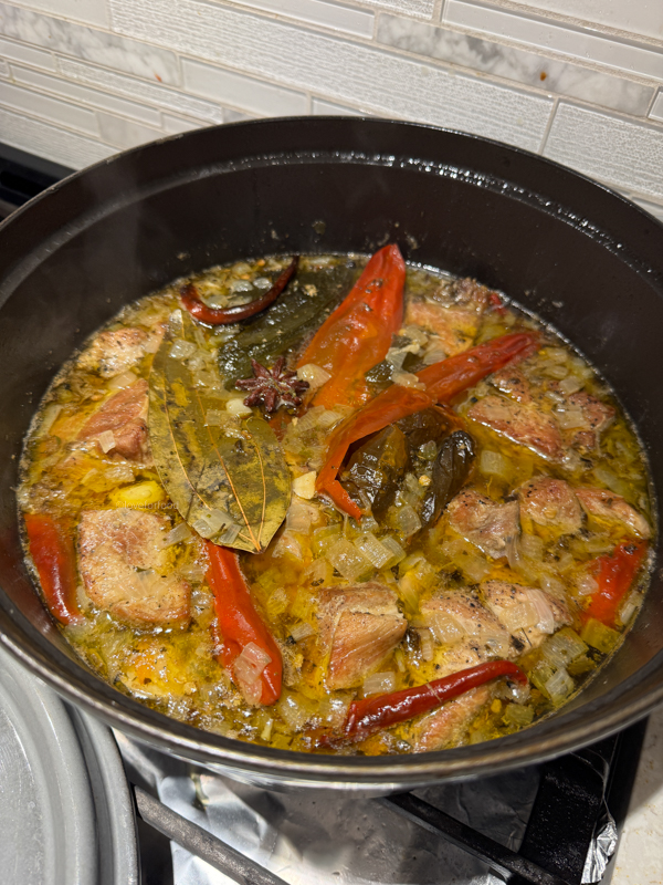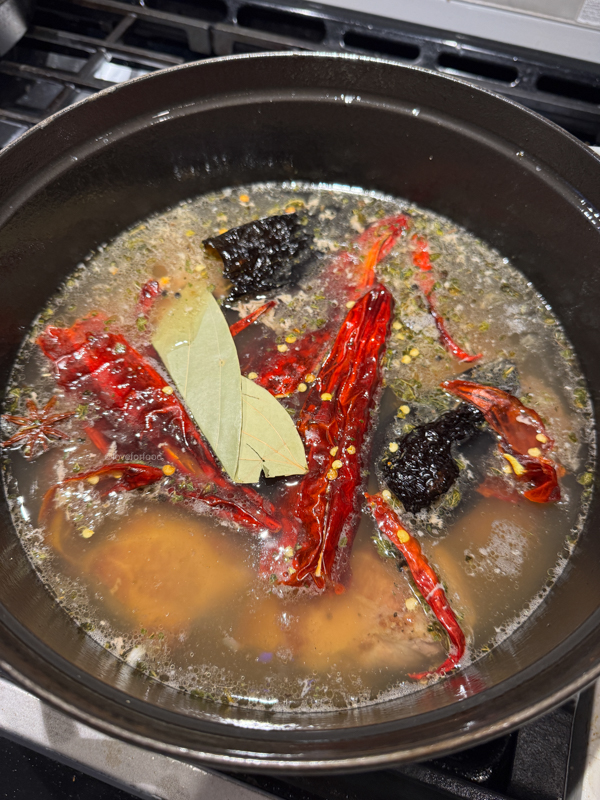 Step 6: Once the spices are toasted, return the pork and chiles to the pot and add the water/broth, bay leaves and kosher salt. Bring to a simmer. Reduce heat to low and let it cook, covered, for 2 – 2 ½ hours.