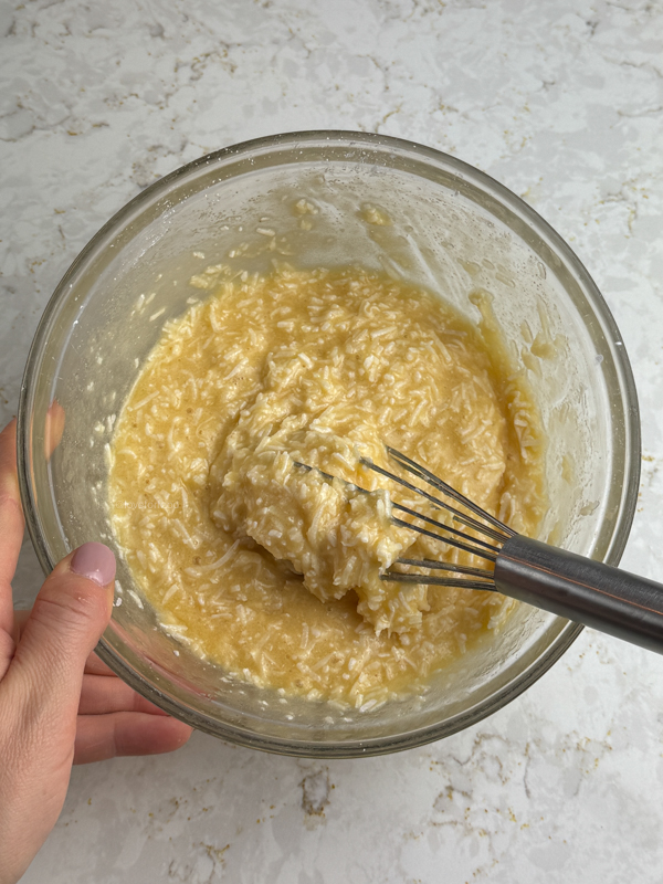 - Slowly whisk in the melted butter, lemon juice, and vanilla to temper (hot butter plus cold eggs can cook the eggs if not combined slowly). Stir in the coconut and set aside.