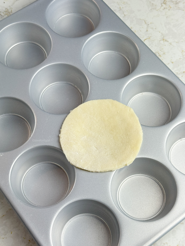 Roll out 1 batch (double crust) of pie dough to 1-2 mm (1/16″) thickness. Use a tart cutter or wide mouth lid/bowl to measure out round pieces of dough 1 cm (⅓-½”) bigger on each side compared to the top of your muffin tin.