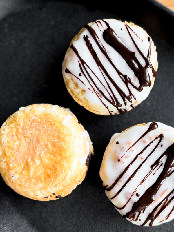 In a small bowl, stir together 2 ½ tsp almond extract with 3 tbsp milk (whole or 2% preferred). Whisk/stir in 1 ¼ – 1 ¾ icing sugar until the consistency is quite thick but still runny. If it completely runs off your tarts and looks too transparent, add more icing sugar.