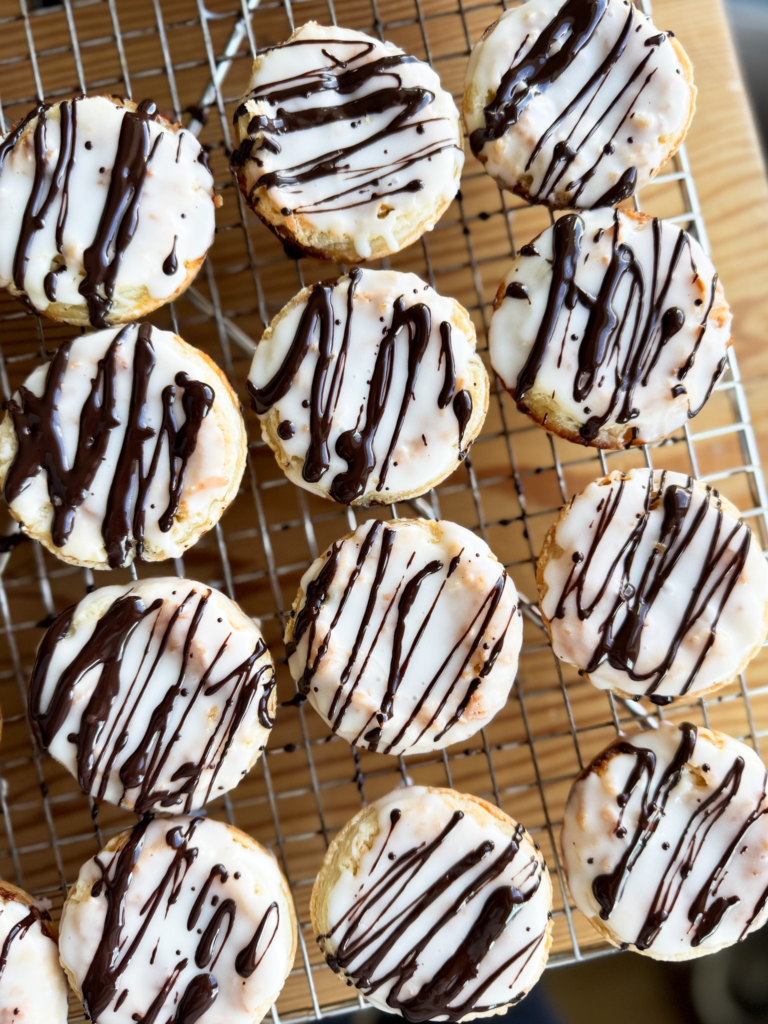 Once the icing has set you can drizzle the chocolate.