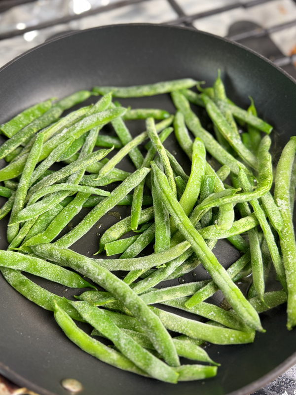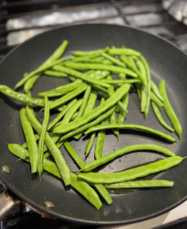 - Preheat a large skillet over medium-high heat. Once hot, add the oil. Swirl in the pan to heat before adding in the green beans. Season with salt and pepper.